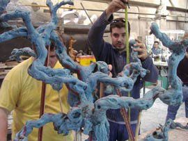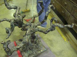 Primero hacemos la reproducción de las viñas originales en cera, después, se recomponen los troncos y ramas de las viñas para formar una cepa que pueda hacer la función de pie de mesa. Posteriormente se hacen las piezas en metal por el método de la cera perdida.